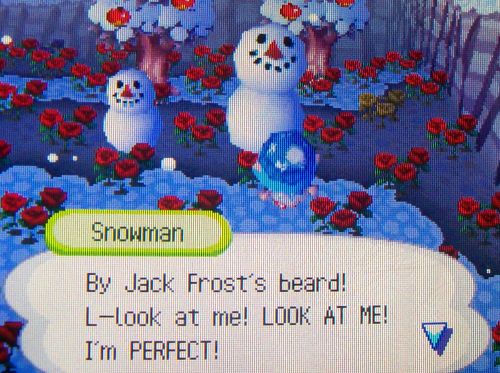 Since he seemed to want company, I built today’s snowman right next to him. 😛 I was surprised he was perfect because I thought the head was too big, but apparently the head being just smaller than the body is AC:WW’s ideal proportion for snowmen.