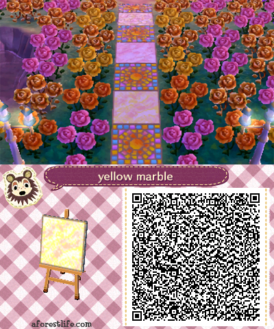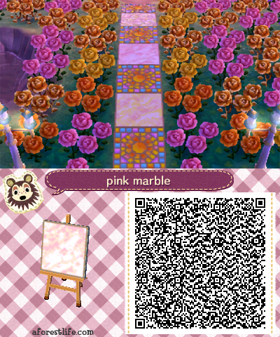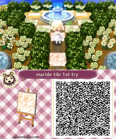 The only marble tiles that I don’t have posted on this page are the ones that are like half/broken tiles with grass on the edges, like in this picture. I didn’t include those because they aren’t going to be very versatile or usable in other towns. Those half-marble tiles only blend in to the specific spaces along the path in that one spot in my town. But all the other marble patterns are on this page, and you can also get all the patterns I’ve used in my town through Wendell if you find him in my dream (4F00-001F-F5E6).